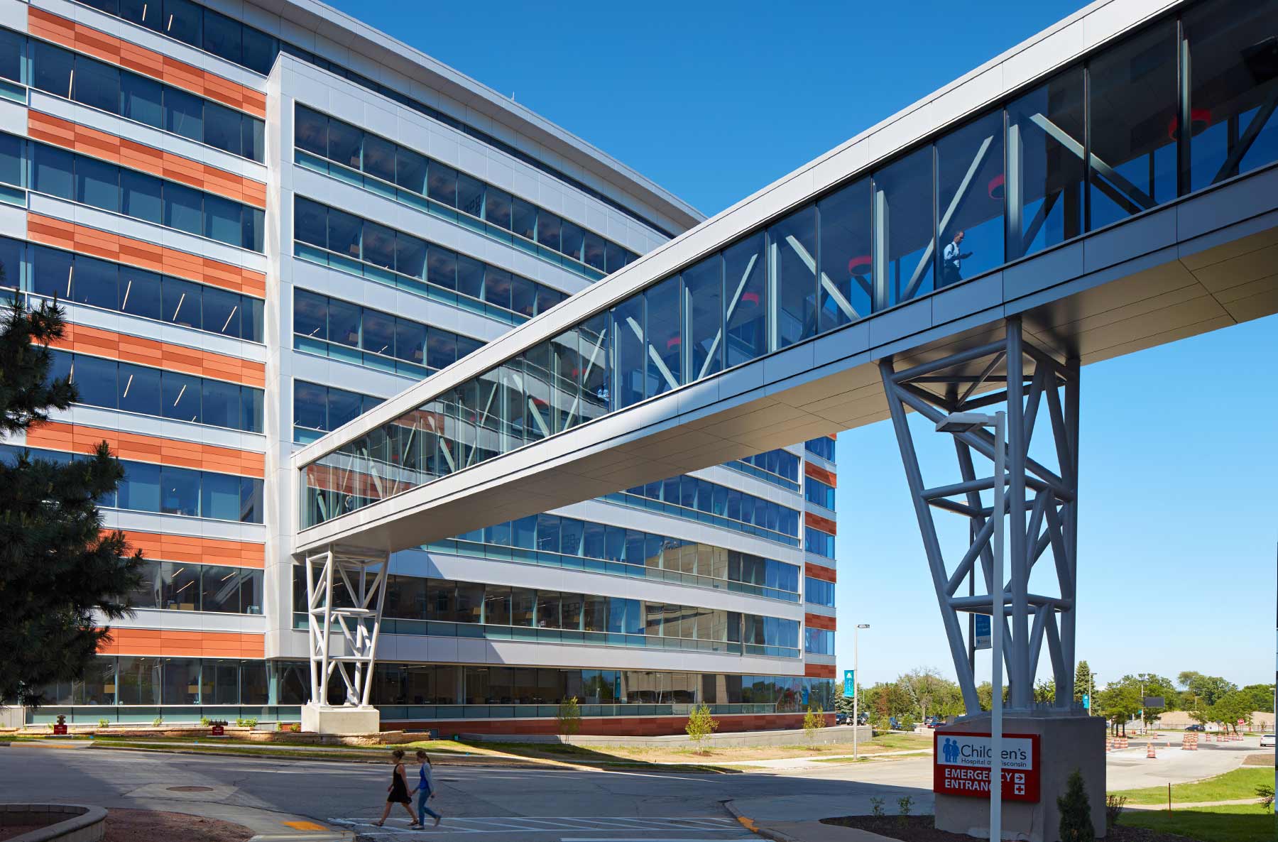 The building is physically connected to the existing Medical Education and Health Research Center buildings to the north at multiple levels, and connected to the Wisconsin Diagnostic Laboratory Building to the south by an enclosed elevated skywalk over Connell Avenue. A physical and symbolic bridge joining the clinical, academic, and research missions of MCW, the building creates efficiencies through proximity and adjacencies; provides adaptable workspaces and shared resources among departments and programs; and incorporates technology connecting staff and faculty.