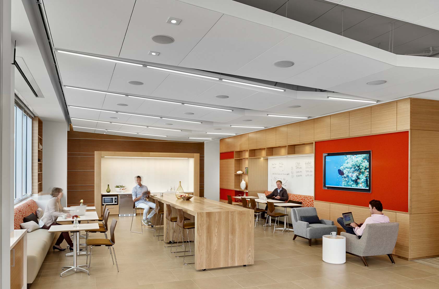 An open workspace environment promotes visibility and access to people, information, ideas, and decisions. For research teams requiring privacy in addition to collaboration, semi-private rooms allow for confidential work or deep concentration for reading, research, and analysis.