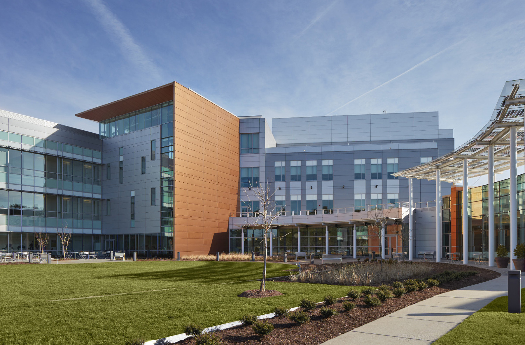 Beyond fulfilling their objective of expanding research capabilities, Syngenta's goal was to amplify their corporate culture through collocated research, non-research, and growing functions on a singular campus in a single facility. To help achieve this, a "ribbon" of community space runs through the center of the complex, providing a full range of amenities that support the four-story laboratory wing and three-story administrative wing.